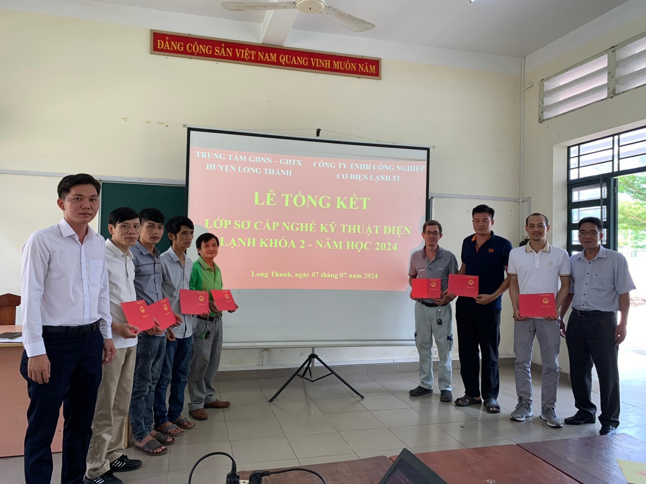Sáng ngày 7/7/2024 tại Trung tâm Giáo dục nghề nghiệp – Giáo dục thường xuyên (GDNN-GDTX) huyện Long Thành đã tổ chức Lễ tổng kết và cấp chứng chỉ Sơ cấp nghề Kỹ thuật điện lạnh cho các học viên lớp sơ cấp nghề Kỹ thuật điện lạnh khóa 2 năm 2024. Tới dự buổi lễ có Ông Lê Hữu Chí phó giám đốc Trung tâm GDNN-GDTX huyện Long Thành, Ông Nguyễn Xuân Nam giám đốc Công ty TNHH MTV Cơ điện lạnh 5T. Cho tới nay Trung tâm GDNN-GDTX huyện Long Thành đã đào tạo và cấp chứng chỉ sơ cấp nghề cho 51 học viên nghề Sơ cấp Kỹ thuật điện lạnh. Các học viên sau khi tốt nghiệp đều có việc làm ổn định (làm việc tại các công ty, cửa hàng hoặc tự mở tiệm).