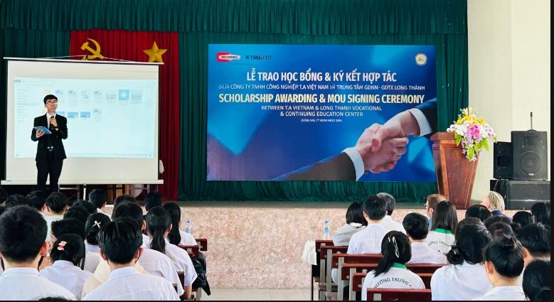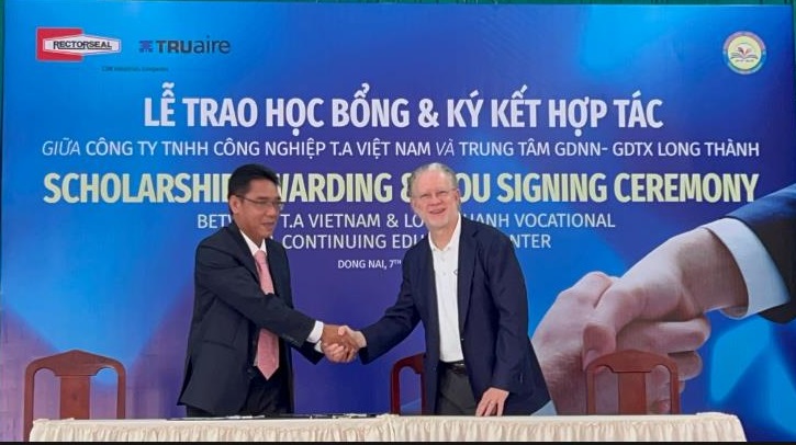 Sáng ngày 7/11/2024, Trung tâm Giáo dục nghề nghiệp – Giáo dục thường xuyên GDNN(-GDTX) huyện Long Thành đã phối hợp cung Công ty TNHH Công nghiệp T.A Việt Nam long trọng tổ chức Lễ ký kết hợp tác đào tạo và trao học bổng cho học sinh. Tham dự buổi lễ có thầy Lê Hữu Chí, Phó Giám đốc trung tâm; ông Joseph Armes Brooks Chủ tịch Hội đồng quản trị tập đoàn CSWI; ông Jeffrey Alan Underwood, Phó Chủ tịch cấp cao kiêm TGĐ công ty RectorSeal; ông Sirichai Chongchintaraksa, Phó chủ tịch cấp cao điều hành Quốc tế kiêm TGĐ công ty T.A Việt Nam cùng các nhân viên công ty, thầy, cô và các em học sinh trung tâm.