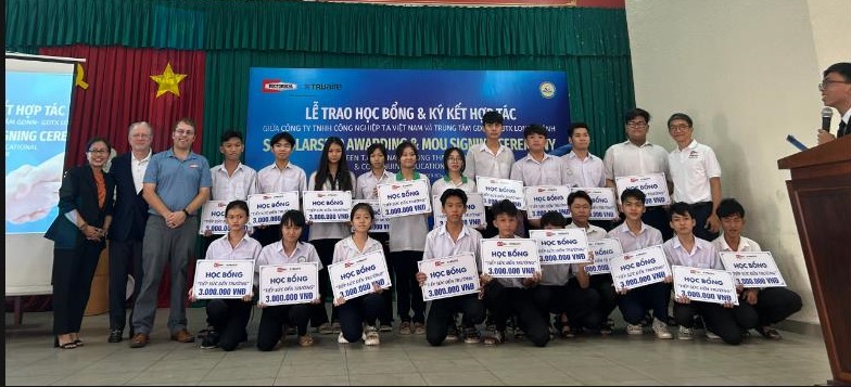 Sau buổi Lễ ký kết hợp tác đào tạo là phần trao học bổng cho các em học sinh. Công ty đã trao 20 suất học bổng cho các em học sinh trung tâm, đây thực sự là món quà đầy ý nghĩa, là giá trị của lòng nhân ái và sự chia sẻ, đồng thời là nguồn động viên dồi dào, giúp các em học sinh, sinh viên giữ vững lòng tin vào tri thức và là động lực lớn để các em bước tiếp trên con đường học tập kiến thức, kỹ năng nghề để lập thân, lập nghiệp.